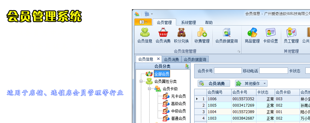 軟件以會員為中心,包括會員信息、會員收費、余額轉賬、會員消費、會員卡掛失/激活、會員換卡、密碼更新、會員延期、積分轉賬、積分兌換、商品管理、卡級設置,以及權限管理、數據字典管理等模塊內容,把科學的管理與信息技術結合起來,幫助企業規(guī)范會員管理的業務流程、提高會員管理的服務質量,達到全面提升企業核心競爭力的目的。
